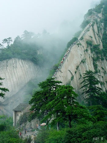 华山的"险"体现在每一个角落。长空栈道悬于海拔2160米的绝壁之上,宽度仅30厘米,被誉为"华山第一险道";鹞子翻身处需面壁贴腹,脚踩石窝,身体悬空而过;苍龙岭如一把利刃直插云霄,两侧悬崖深不见底,宽度仅1米左右,古人形容"不登苍龙岭,不知华山险"。